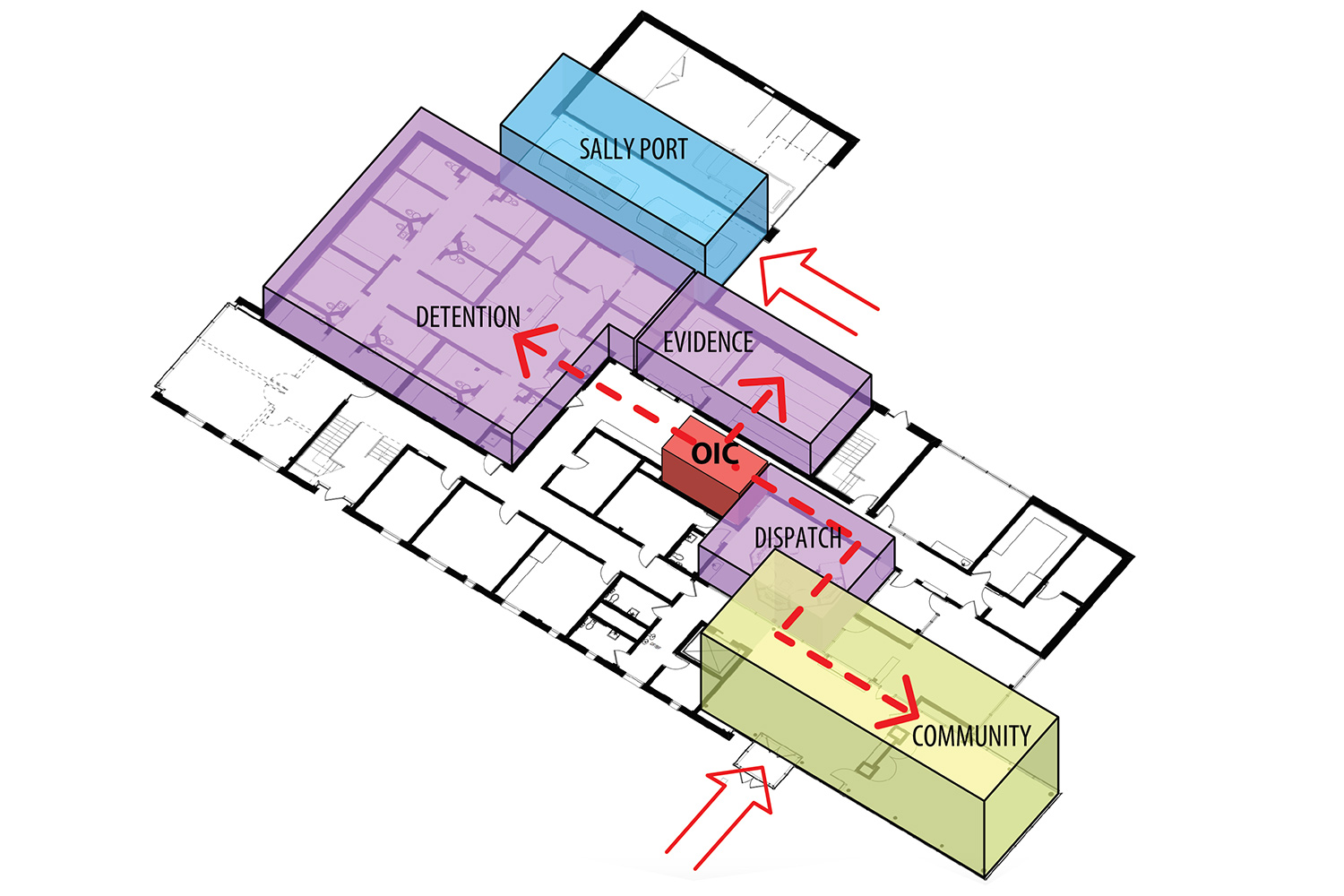 The interior design creates a connection to the community at one end and a light-filled work space for officers that encourages teamwork on the other. A two-story stair connects offices with roll call and their station commanders with visual openness and special connectedness that creates a bridge to all members of the department.