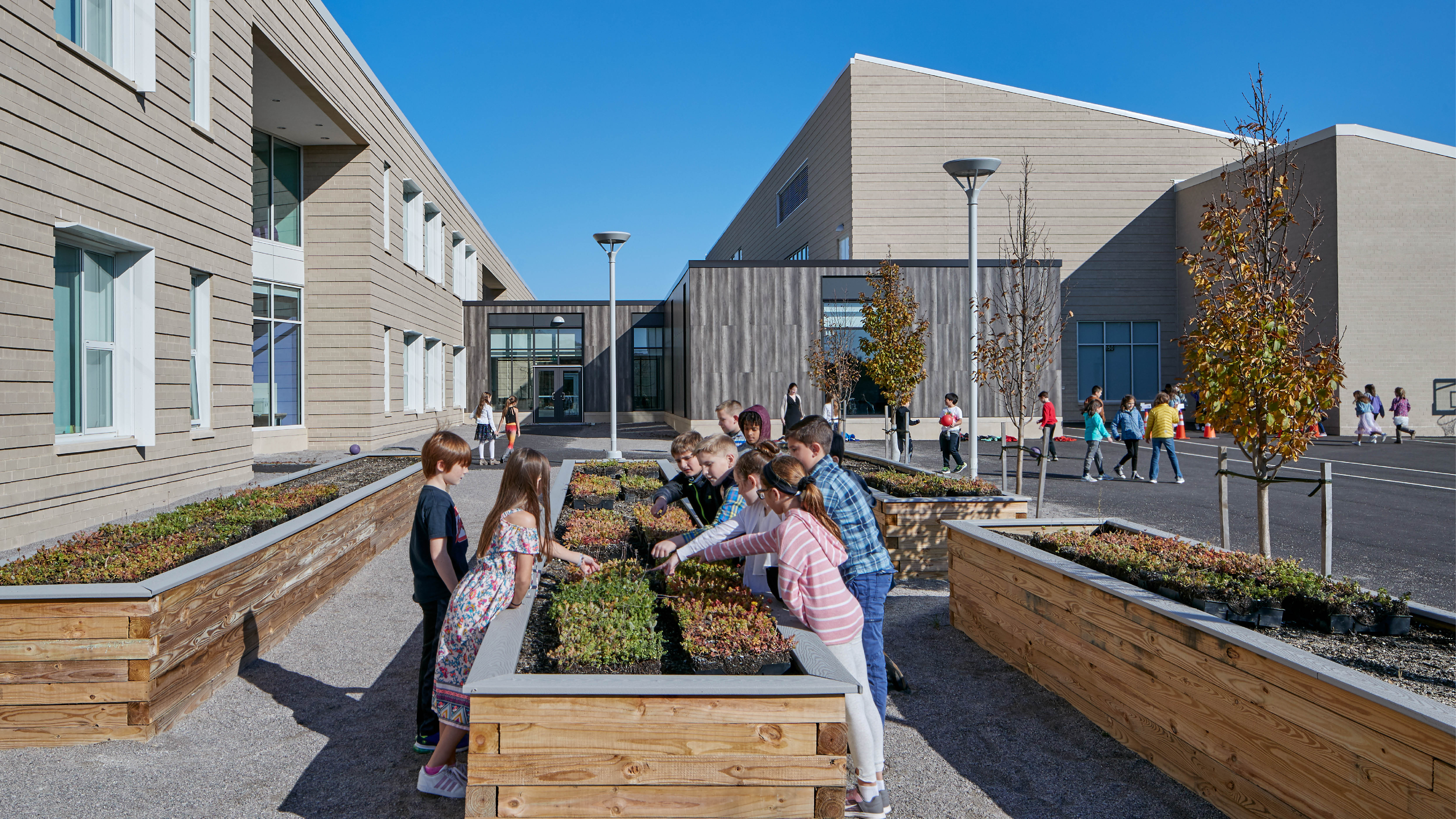 The visioning process involved meeting with a variety of stakeholders and synthesizing information from all parties, including the school district and the public. Community members participated in web-based surveys and attended 20 community forums spanning over 14 months. Topics focused on evaluating multiple grade configurations on various sites, educational visioning, and sustainability. This project used an integrative design process to achieve a sustainable and holistic new school focused on community wellbeing. Placement on the campus, enhancing green space and building orientation were considerations of the local microclimate.