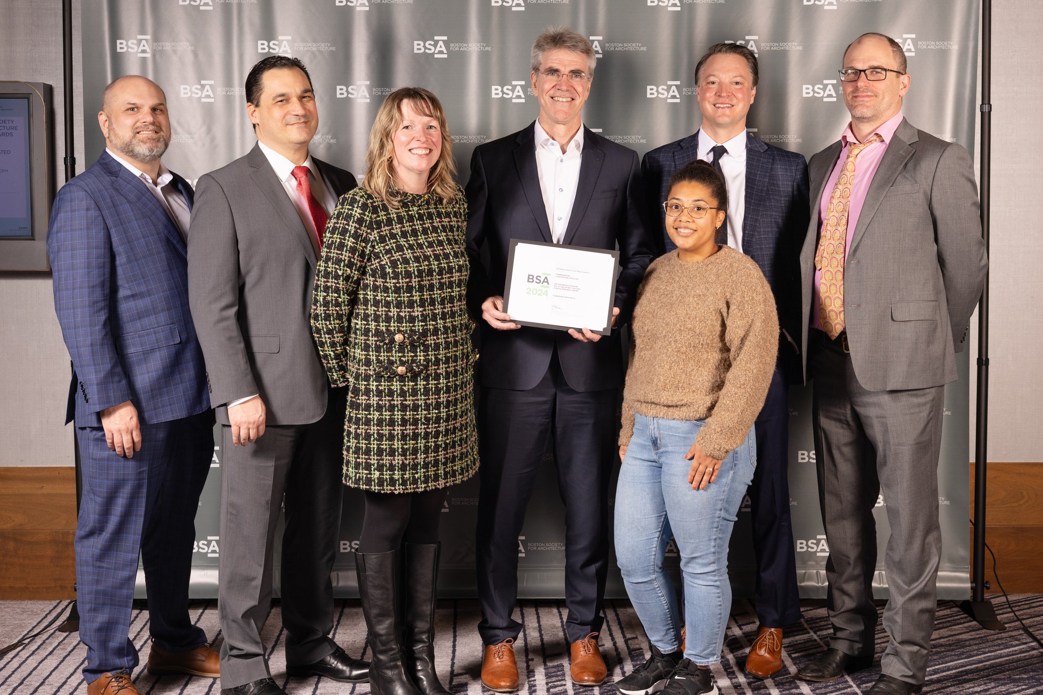 The BSA Design Awards program celebrates exemplary innovation in the built environment, investment from committed clients, and the unique power of architecture to design buildings and spaces that transform communities and shape the way we live. The BSA honors projects that embody the values of the AIA Framework of Design Excellence and the BSA’s vision of building a just and sustainable Boston, together. The Flansburgh team, was joined by Governor’s Academy Chief Financial Officer Jon Douglas, to celebrate this achievement.