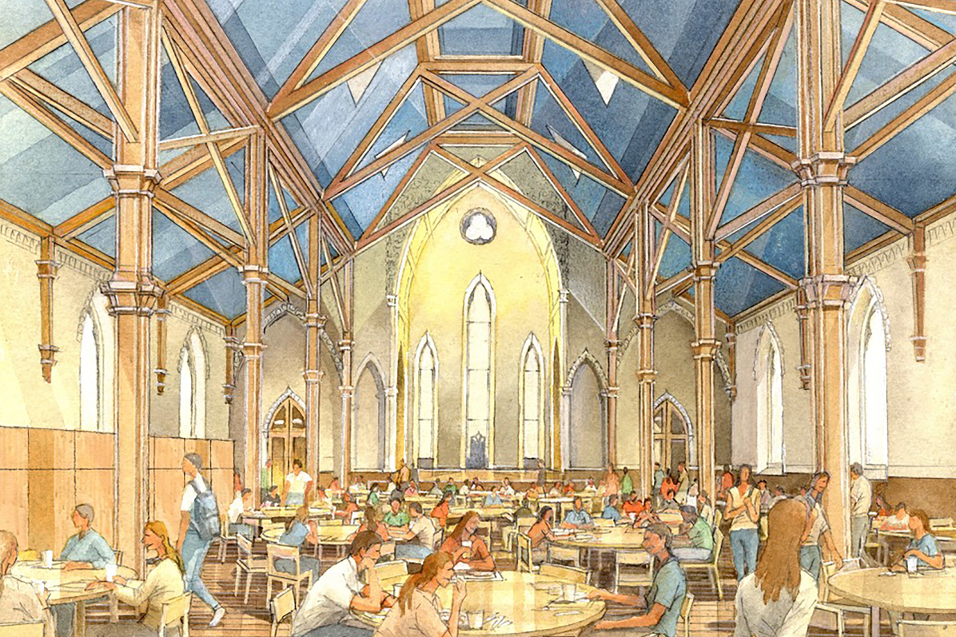 This transformation will connect the Chapel's historic integrity with the needs of a modern facility. During the renovation process, the original vaulted ceiling of the Chapel has been dramatically revealed, restoring the space's sense of height and grandeur. Further work will involve carefully uncovering and restoring the original stained-glass windows, allowing light to stream into the new Commons as it did generations ago.