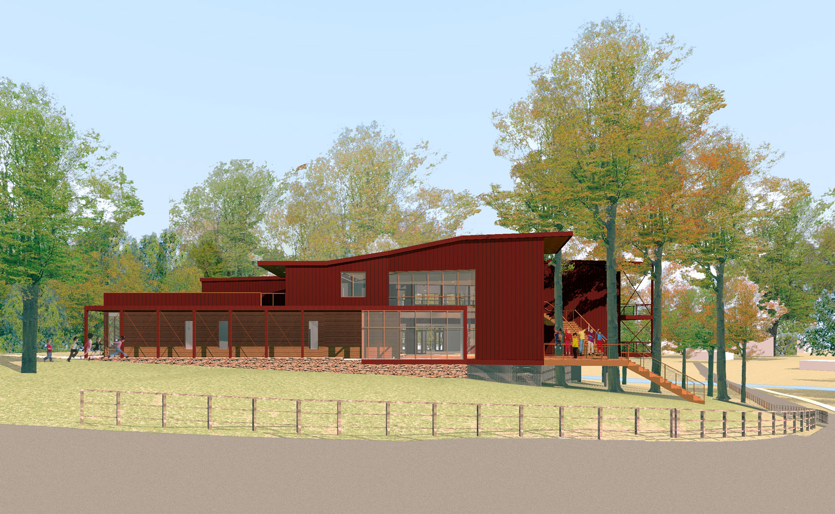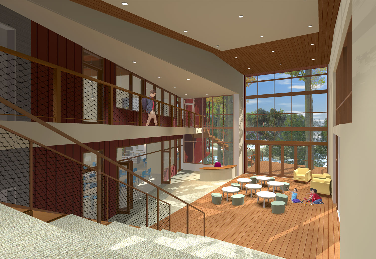 Flansburgh Architects has completed the design of a new 11,000 SF classroom building for the Barrie School that will include seven classrooms and a large common room. The building is nestled among the large beech trees of the wooded campus with decks, terraces, and outdoor stairs creating a treehouse feel. The inclusion of outdoor space for every classroom, a key element for the Montessori program, was a priority for Barrie. The common room features an amphitheater stair that links the large gathering space with an upper floor outdoor terrace, and is connected to a large outdoor deck on the first floor. This space will be used by the entire school community.