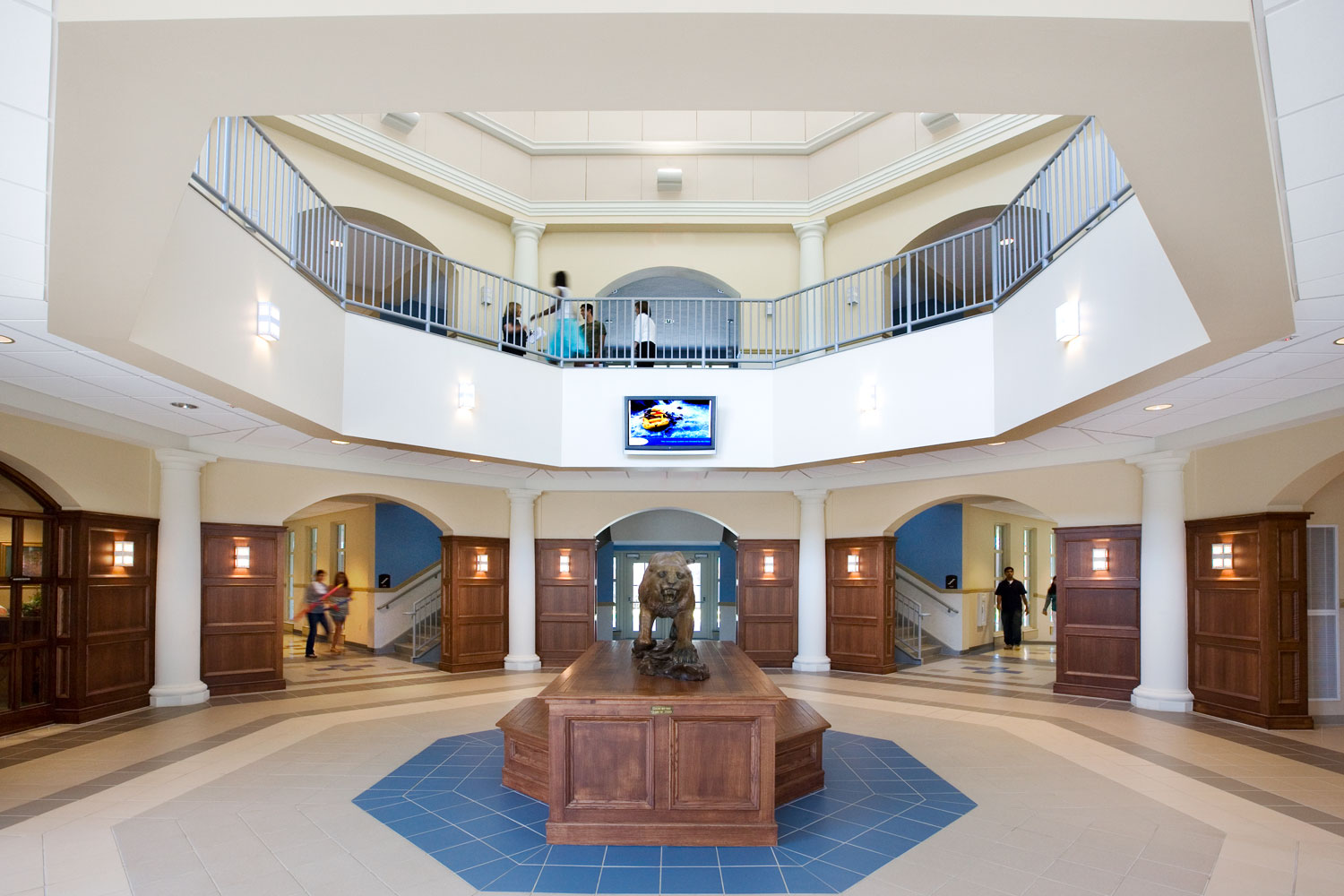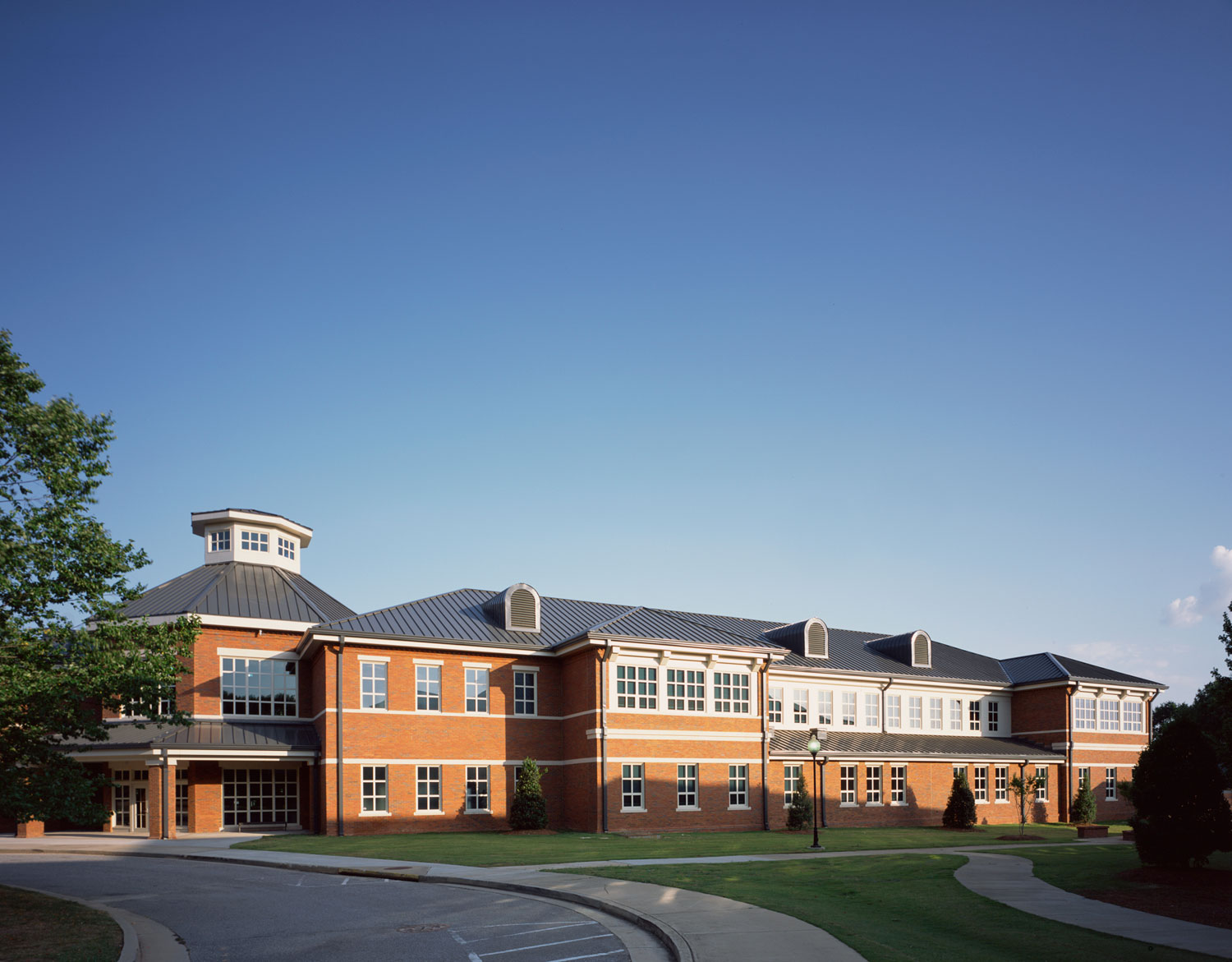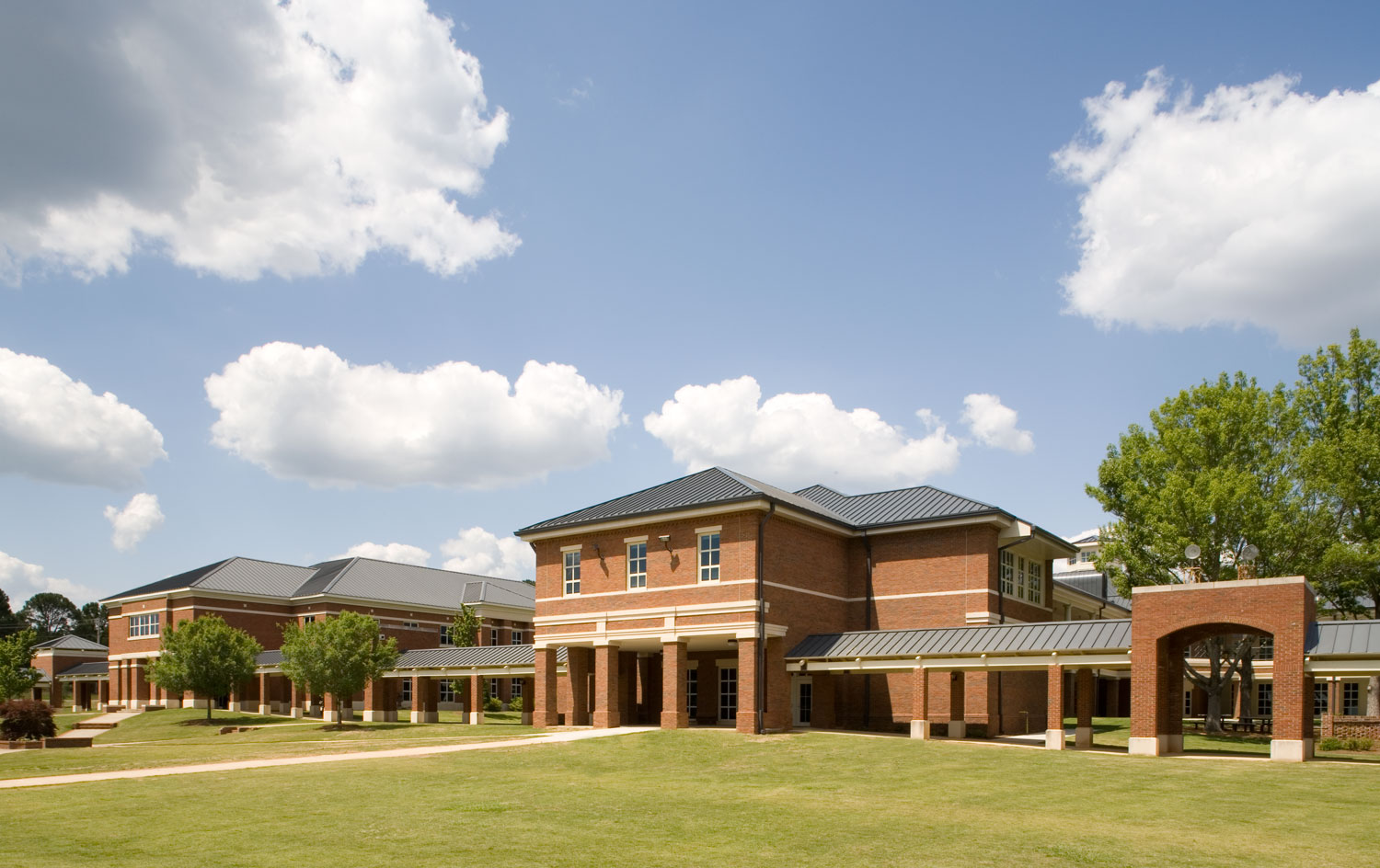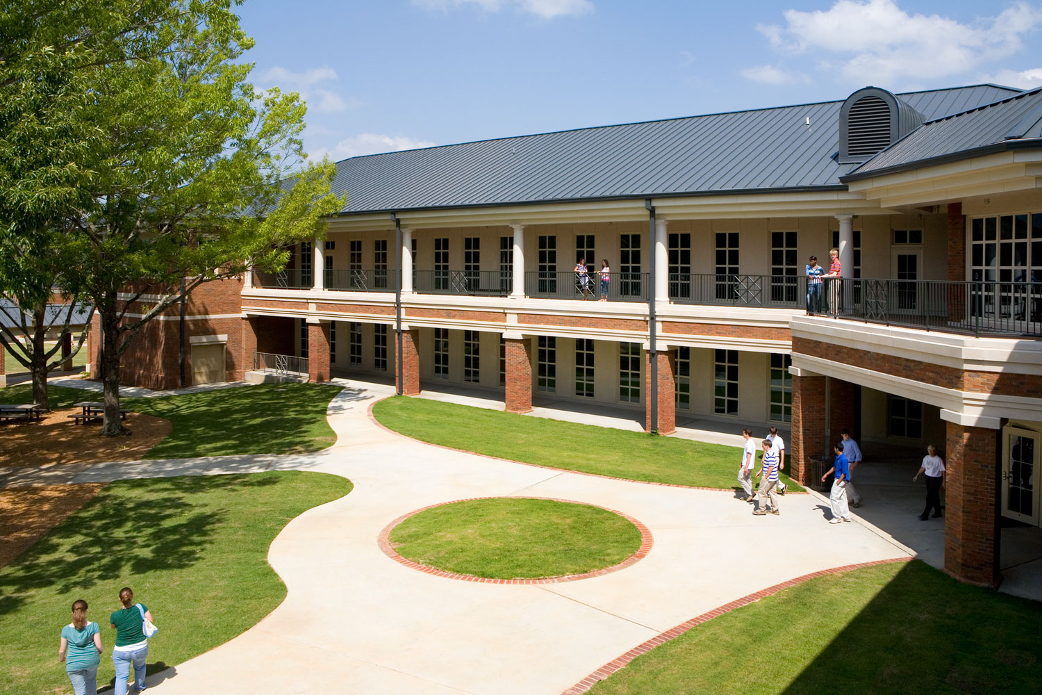 The new upper school building embraces the classical style of the existing campus while being environmentally responsive. A geo-exchange heating and cooling system will use the earth’s heat-sink ability to dramatically lower electricity usage. Deep overhangs and broad loggias on the southeast and southwest facades keep out direct sun to reduce solar gain and provide generous outdoor areas for group study.