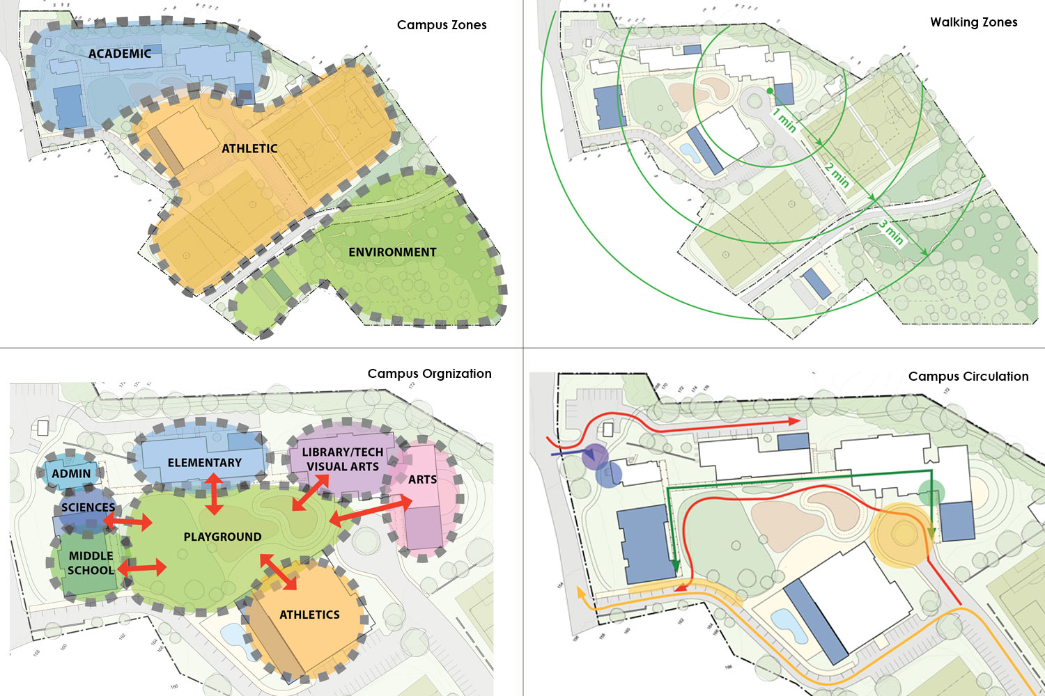 The playground is the geographical and metaphorical heart of the campus. The importance of the playground is recognized and reinforced by locating new construction around the periphery of the playground. In order to foster more collaboration between and within divisions, the master plan proposes a slight reorganization of the campus. For example, the science rooms are brought together. All Elementary classrooms and Middle school classrooms are united in their respective buildings. Finally, library, technology, and visual arts are brought together with the performing arts in the Community Building to create a creative commons that is used by all students.