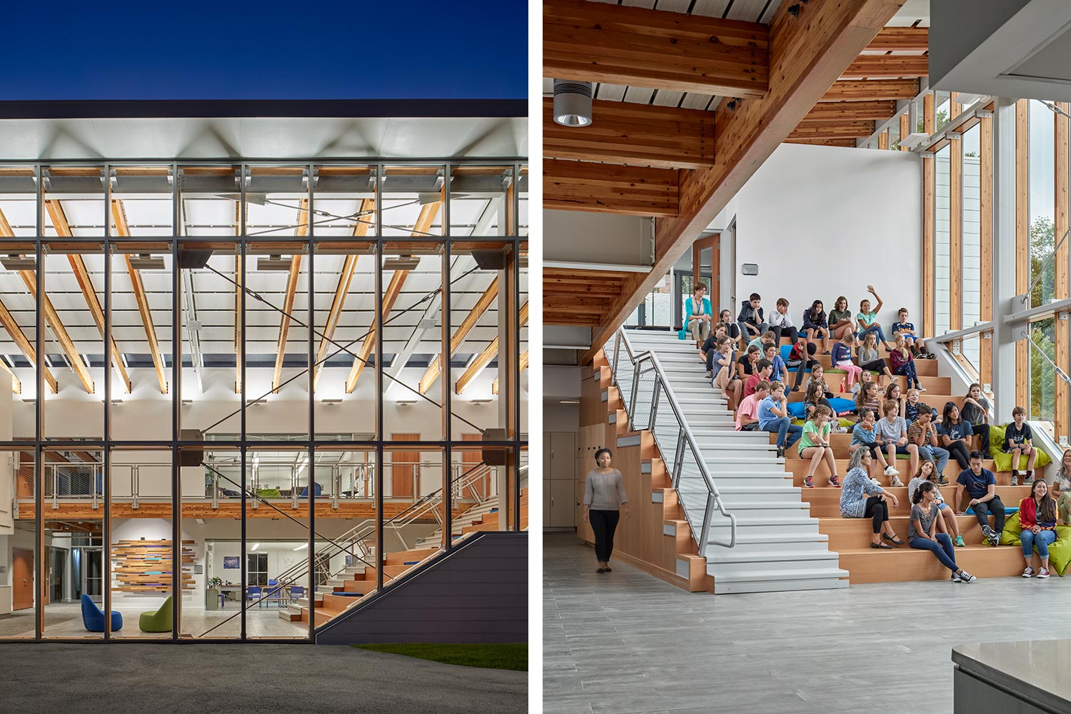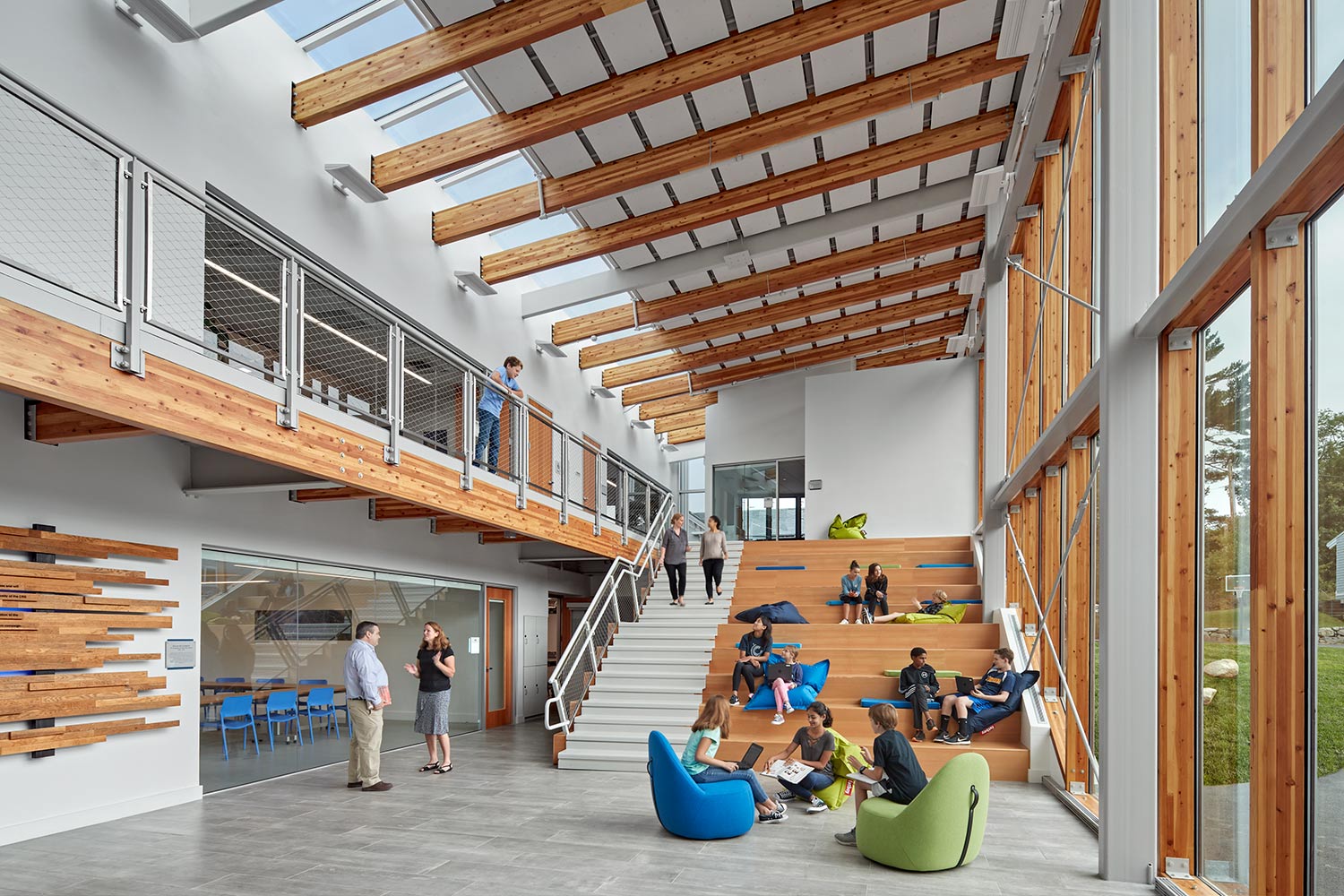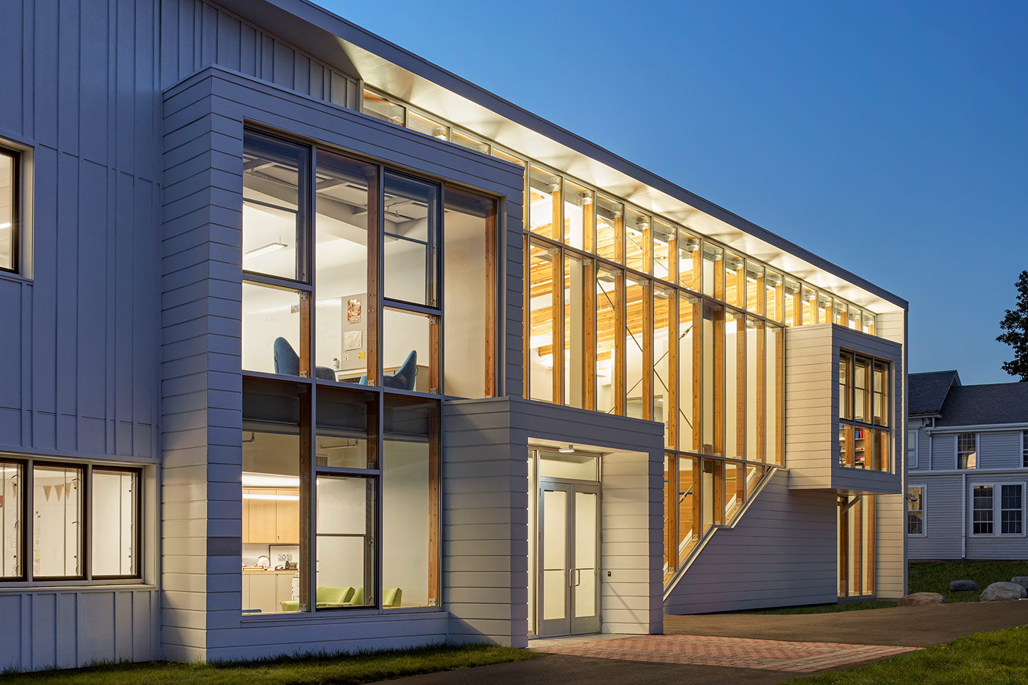 Located at the heart of Dover, the building sits across the street from the Town Hall. In response, the front facade is designed to fit contextually into the historic town center, with traditional board-and-batten siding and double-hung windows. Facing the rear into the school, however, the building takes a more contemporary forms, with a two-story, wood-framed glass wall revealing a large common gathering area in the center of the building. Eight classrooms as well as breakout rooms, a faculty room, and a kitchen, open onto this central space, which features a amphitheater-style seating area.