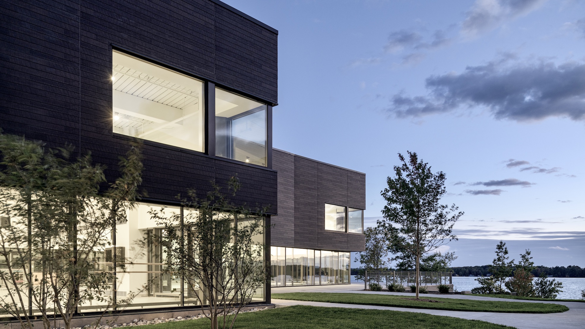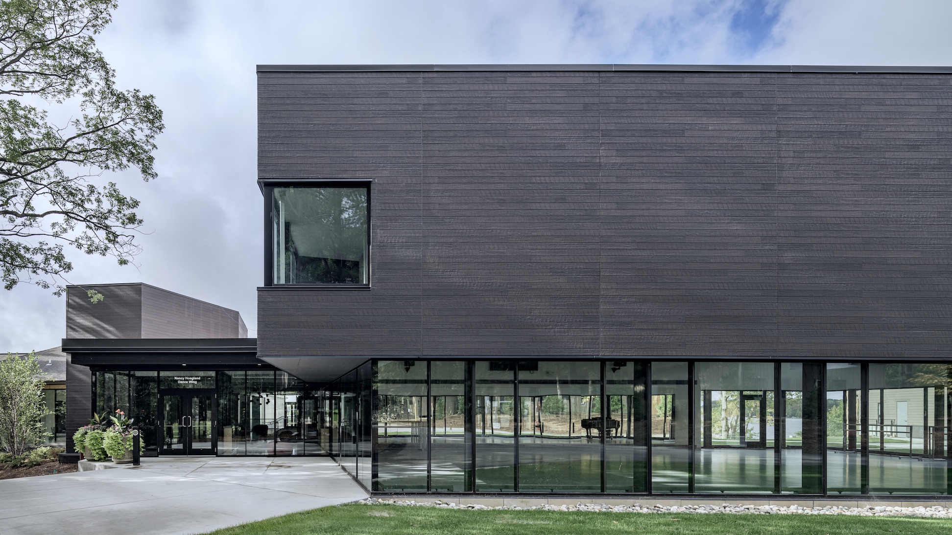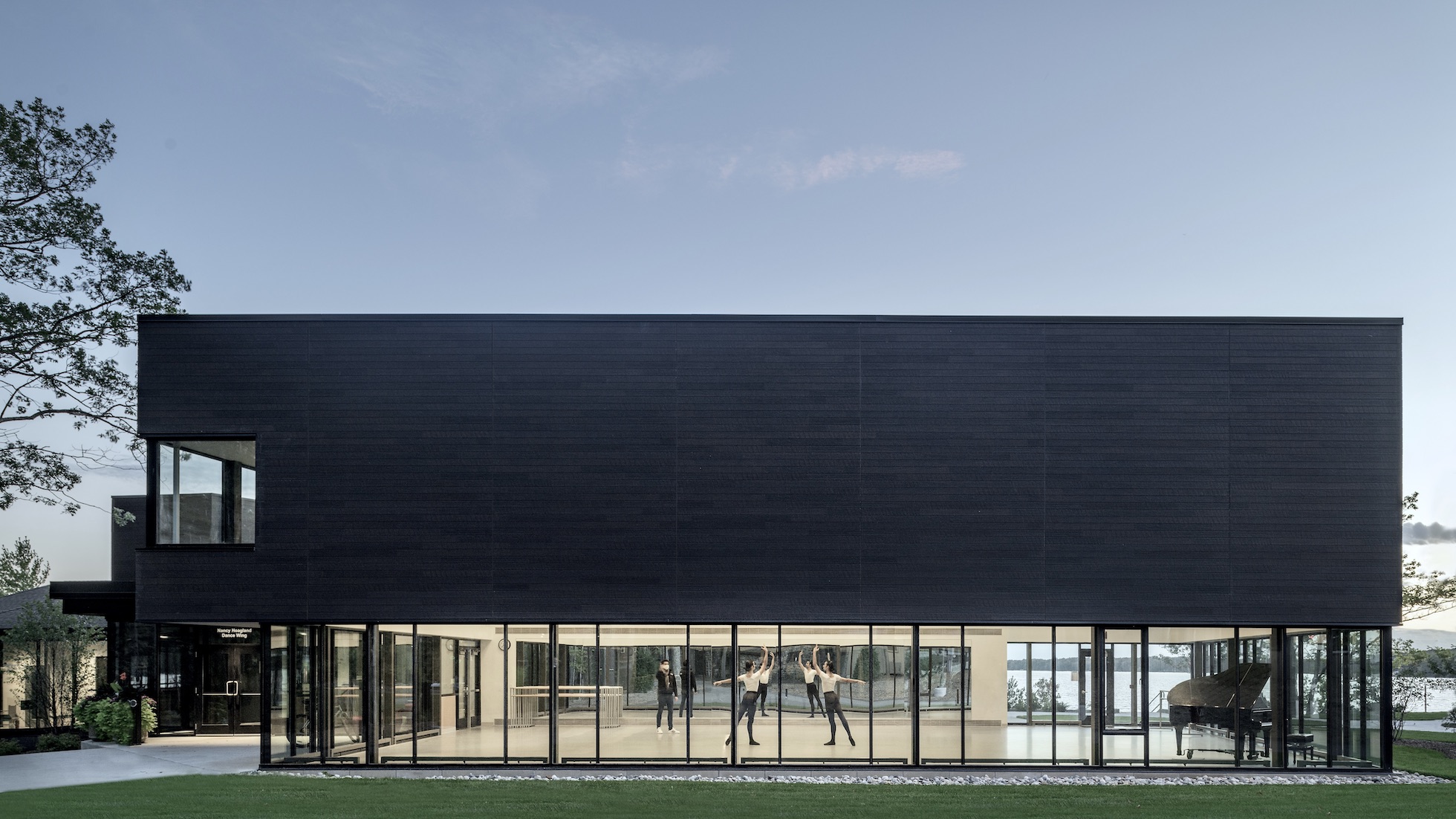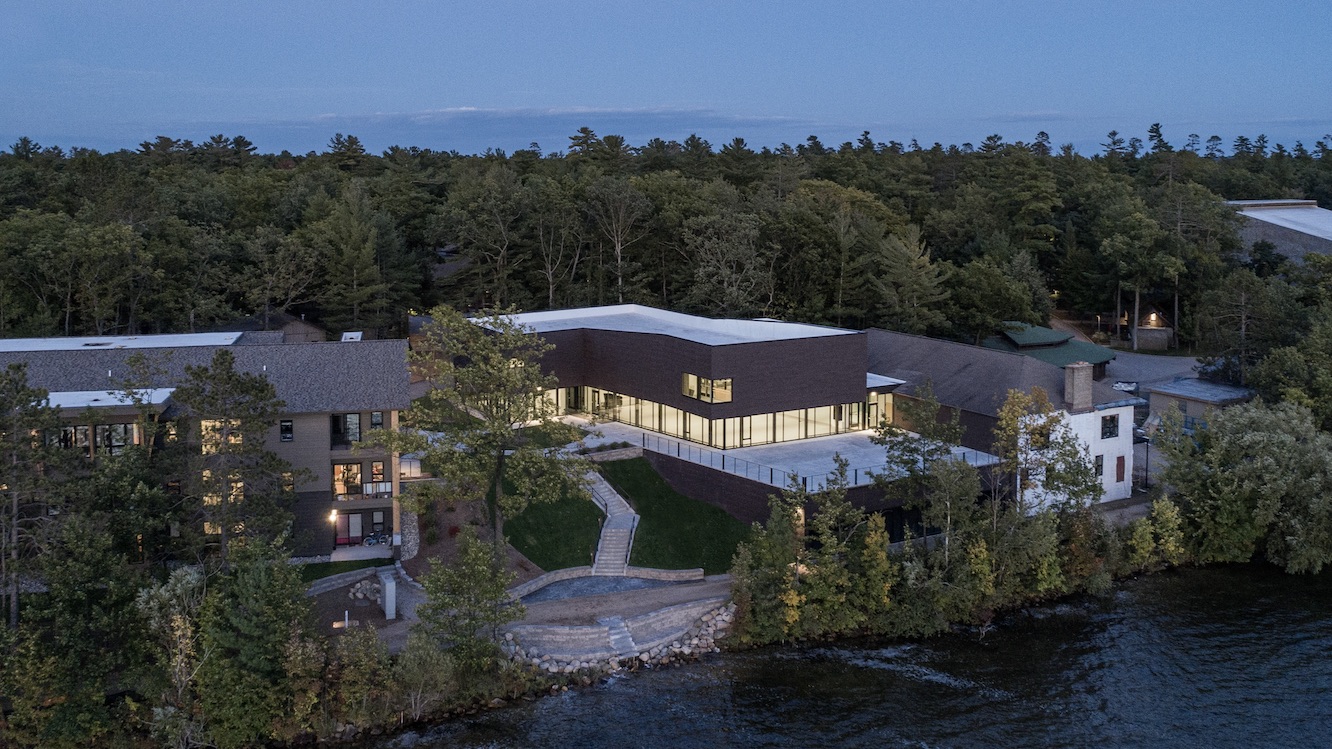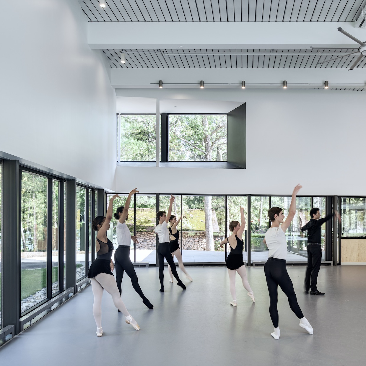 The new studio addition takes its cues from the Kresge Auditorium, a mid-century outdoor amphitheater seating 4,000 with its sculptural roof and exposed wood and steel structure. The shape of the roof celebrates the movement of dance as it gestures towards the lake. The addition adds three new studio spaces, each with a view to the lake that open onto outdoor decks and performances spaces that also overlook the lake. The combined building is organized around a new entrance lobby that visually connects the existing studio with the three new studios so that visitors and dancers can see multiple dance rehearsals at one time.