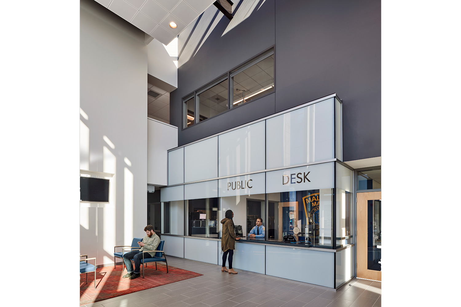 The interior design creates a connection to the community at one end and a light-filled work space for officers that encourages teamwork on the other. A two-story stair connects offices with roll call and their station commanders with visual openness and special connectedness that creates a bridge to all members of the department.