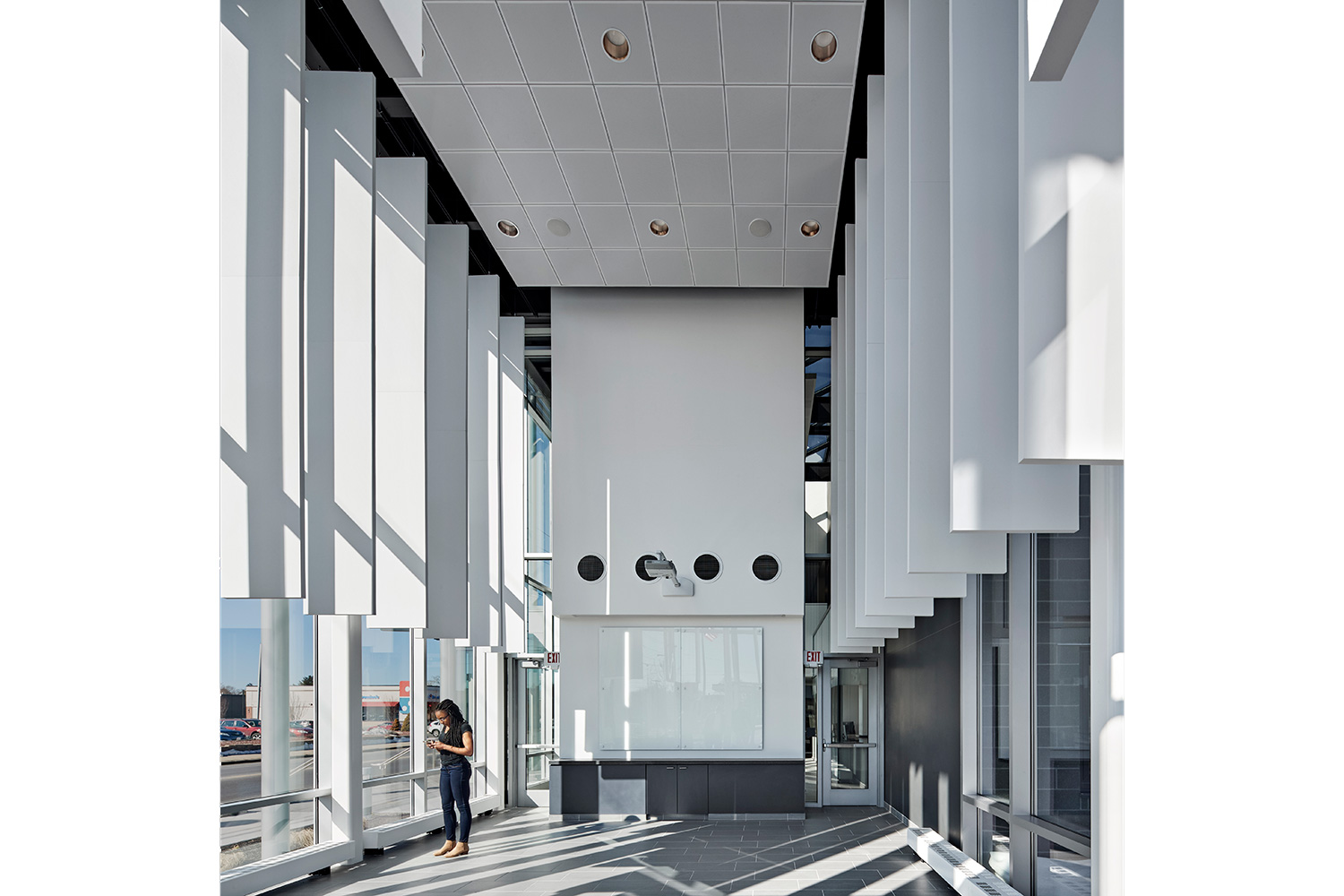 The exterior of the facility is designed to establish a new modern vision for the existing industrial corridor. The use of polished CMU, fiber cement panels and glazing compliment neighboring buildings, while new shapes and patterns on the structure create a distinct identity from Eastern Ave.