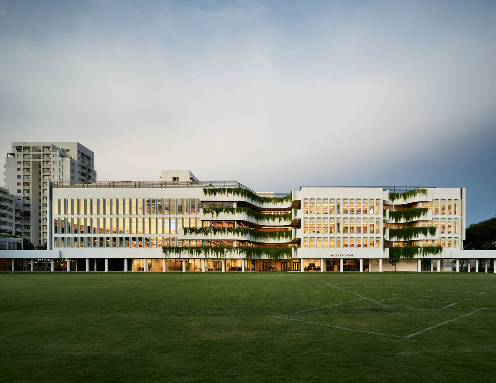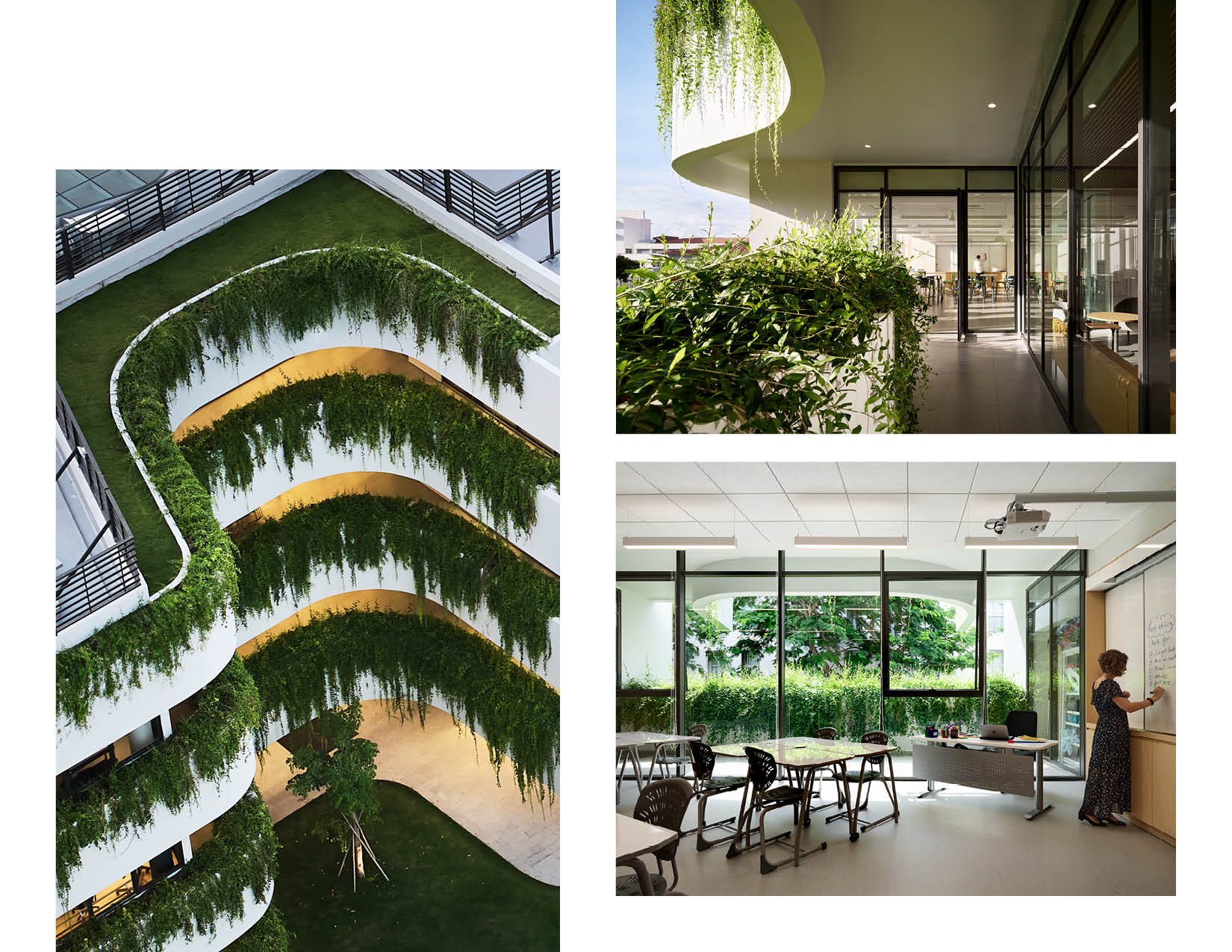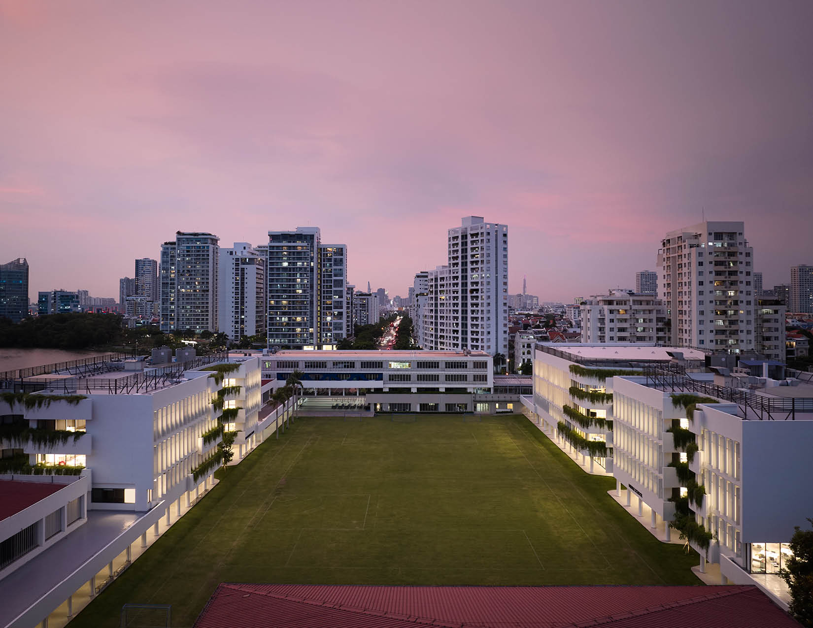 The two buildings are thoughtfully positioned on opposite sides of an expansive athletic field and green space. Their architecture complements one another with light colors and undulating curves that interact harmoniously with their gridded structure. Planters, inspired by the terraced rice fields of Sa Pa, accentuate the curvature of the facility, cascade with native species, provide visual interest, and break up the building plane. The dynamic interplay of these elements is accentuated when the wind or rain introduces movement to the lush greenery. The interiors of the atria feature bamboo that upholds a commitment to local aesthetics and sustainability, and capture daylight. Levels of the building serve as metaphorical branches extending to exterior garden balconies and ultimately to the river, fostering a seamless connection between educational spaces and nature.