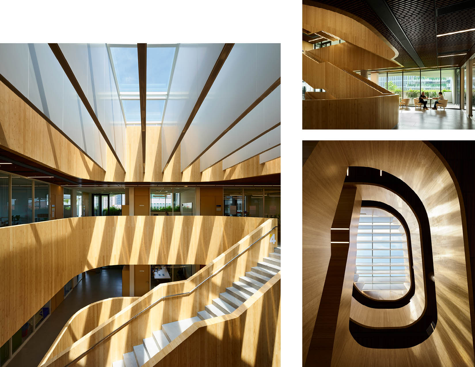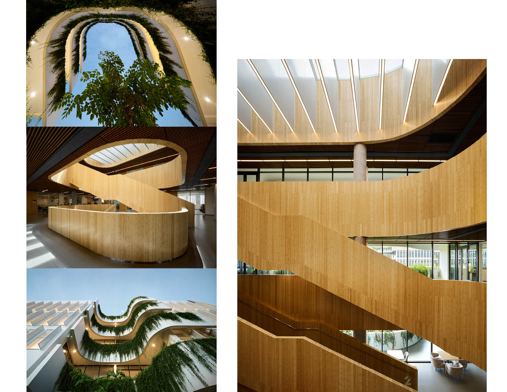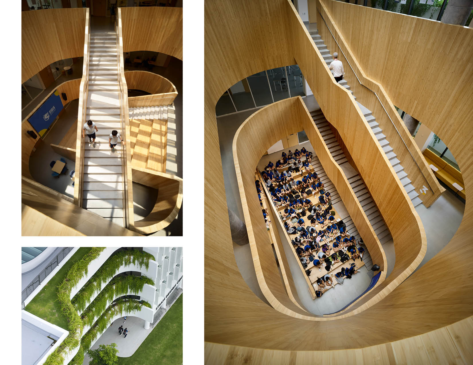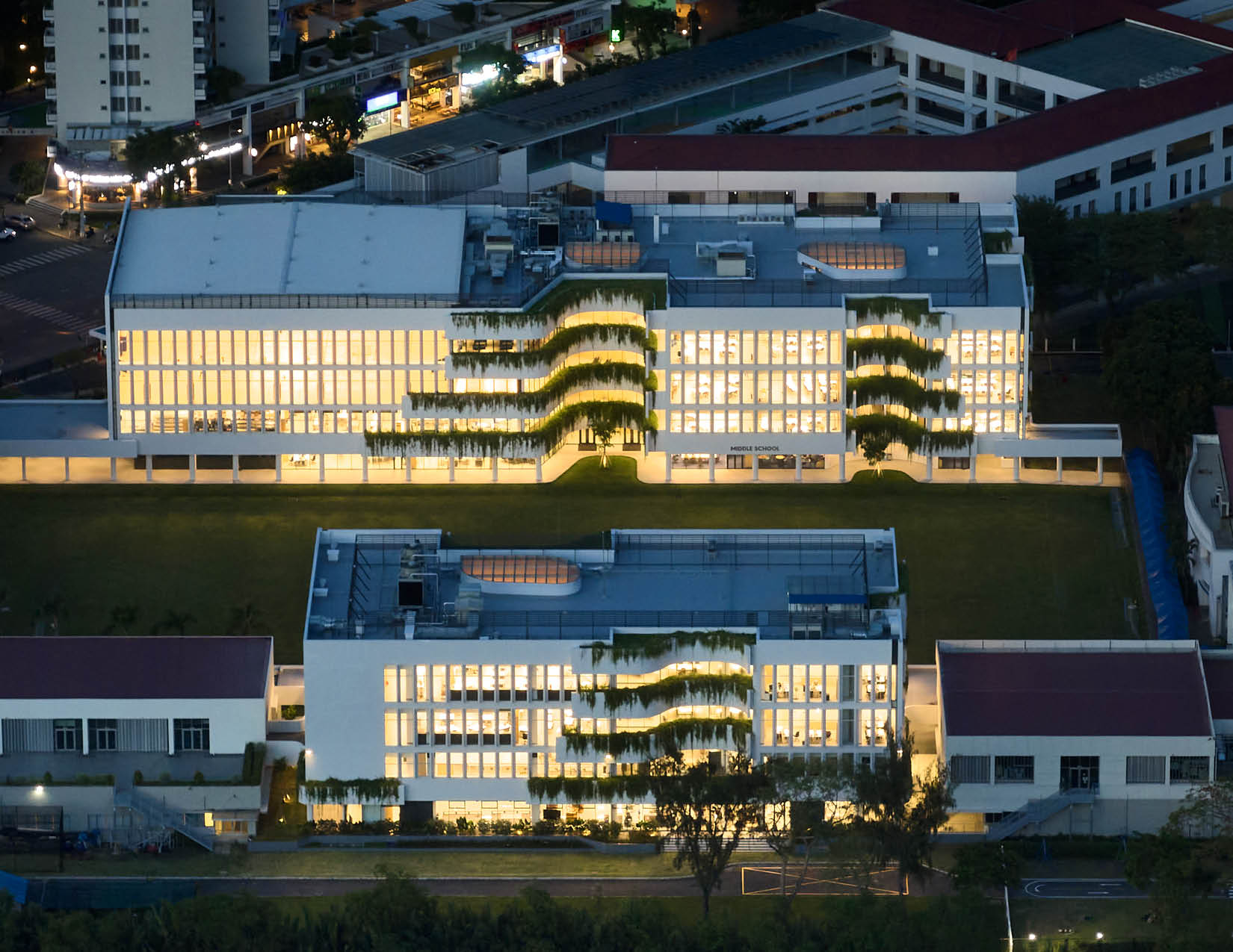 The two buildings are thoughtfully positioned on opposite sides of an expansive athletic field and green space. Their architecture complements one another with light colors and undulating curves that interact harmoniously with their gridded structure. Planters, inspired by the terraced rice fields of Sa Pa, accentuate the curvature of the facility, cascade with native species, provide visual interest, and break up the building plane. The dynamic interplay of these elements is accentuated when the wind or rain introduces movement to the lush greenery. The interiors of the atria feature bamboo that upholds a commitment to local aesthetics and sustainability, and capture daylight. Levels of the building serve as metaphorical branches extending to exterior garden balconies and ultimately to the river, fostering a seamless connection between educational spaces and nature.